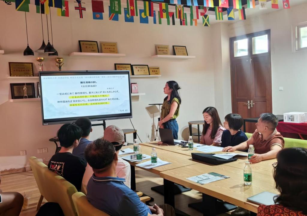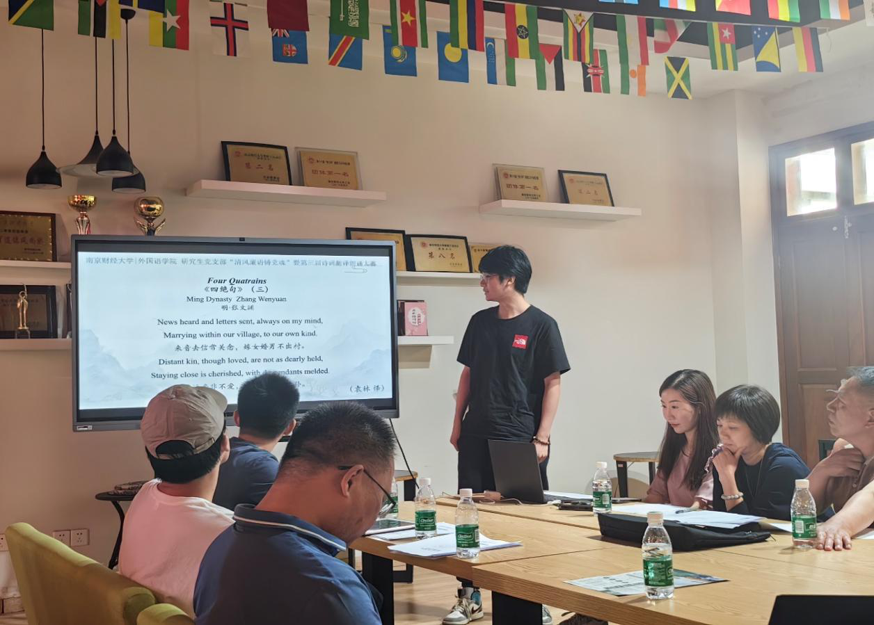 在诗词朗诵过程中,张高远教授和潘秋凤副教授分别对同学们的英日文翻译作品进行了点评。张高远教授在翻译诗句中符号的运用、介词的使用、合辙押韵情况、诗句选词用词、对诗句内涵的理解等问题上和大家进行了探讨。潘教授肯定了日语专业同学在译文中对日语古韵的恰当使用,但同时指出,诗词翻译应该以准确表达原意为主,在此基础上再斟酌字句押韵,一些时态和词的基本使用形式也需要注意。